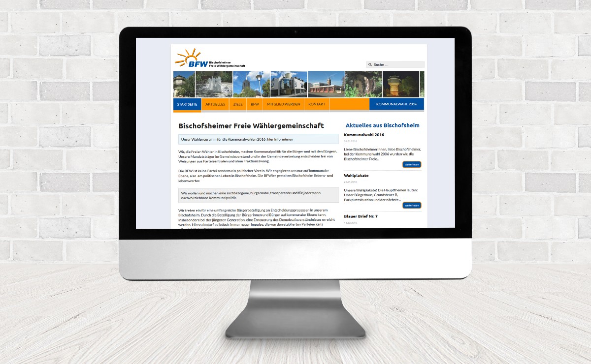 Die Freien Wähler Bischofsheim haben Ihre Webseite ohne Fachwissen immer selbst gestaltet und sich einiges Wissen selbst angeeignet. Die Werkzeuge waren oftmal Generatoren, die animierte Buttons oder ähnliches generiert hatten. Doch in der heutigen Zeit haben auch solche Generatoren seltenheitswert, da die Technik und die Anforderungen an eine Webseite andere sind. Nach einer ausführlichen Analyse und Beratung wurden wir mit dem Redesign der Webseite betraut.
