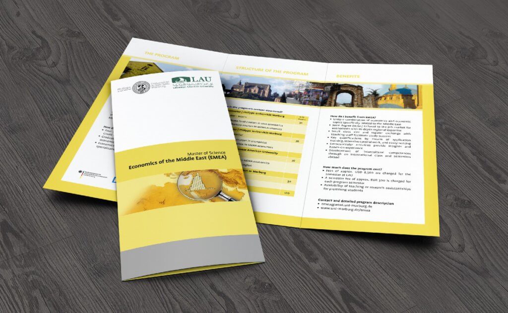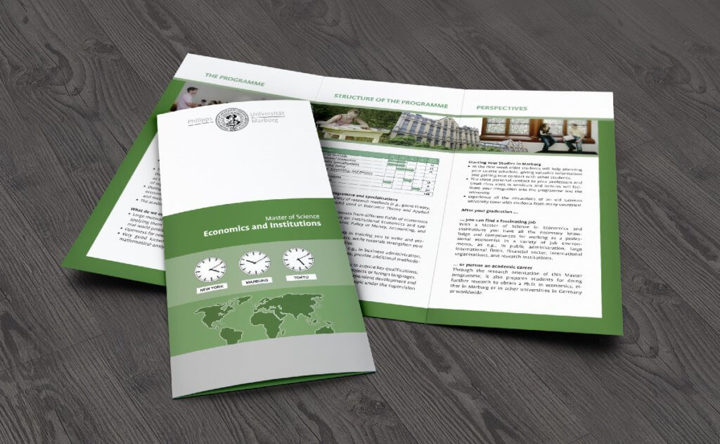Für jeden Fachbereich wurden Faltflyer erstellt, die den Studieninhalt detailliert und zielgruppenorientiert darstellt. Dabei gilt:Für Bachelor Studiengänge wird der Slogan „Step into your Future“ verwendet und für Masterstudiengänge „Master your Future“. Das Titelblatt und die Farbgebung werden jeweils an die Emotionsfläche des Studiengangs angepasst. Auch inhaltlich haben wir uns um eine einheitliche Designlinie gekümmert indem wir alle Diagramme neu entwickelt und umgesetzt haben.