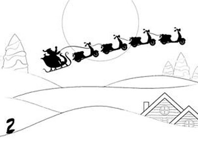 Für den ersten Eindruck: Als erstes zeichnen wir ein ganz grobes Skribble (Bild1), hier kritzeln wir die Idee schnell und ohne Feinheiten auf das Papier. Auf die ungefähre Anordnung und Proportion wird dabei geachtet. Im Anschluss legen wir die Konturen an und zeichnen die einzelnen Elemente detailliert (Bild2). Der Weihnachtsmann, der eine Glocke läutet, die Roller, die Bäume mit dem Schnee, alles erhält seine eigentliche Form. Farben? Natürlich wird das Ganze noch farbig, aber welche Farben verwenden wir? (Bild3). Nachdem die Farben feststehen erfolgt als erstes die räumliche Darstellung (Bild4). Mit sanften Farbverläufen sind die Berge modelliert worden. Die Blockhütten haben durch farbige Abstufungen und leichte Holzmaserungen sehr an tiefe gewonnen. Die Bäume wirken nun auch rund und der Himmel wird vom Mond aufgehellt. Zum Abschluss gab es noch die Feinheiten (Bild5) z.B. der Schnee auf den Blockhütten. Ein paar Schneeflocken lockern den blauen Nachthimmel auf. Die Roller haben Ihre Scheinwerfer an und das Firmenlogo unseres Kunden wurde ebenfalls eingeschneit in die linke obere Ecke positioniert. Während der Kaminrauch eingearbeitet wurde kam noch eine Idee auf, die im Skribble nicht vorhanden war. Ein paar Reifenspuren im Schnee geben sicher noch mehr Tiefe in das Bild und rücken das Produkt des Kunden weiter in der Vordergrund.